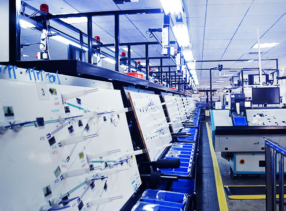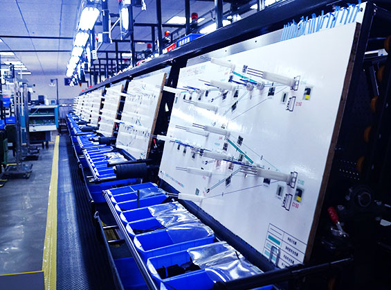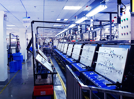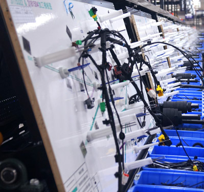 車間配有全自動裝配生產(chǎn)流水線,有專業(yè)非標(biāo)定制的線束圖板裝置;圖板上標(biāo)示有布線路徑且配置有布線夾具,通過沿著布線路徑進(jìn)行布線來裝配線束,能夠滿足快速更換產(chǎn)品型號的需要。